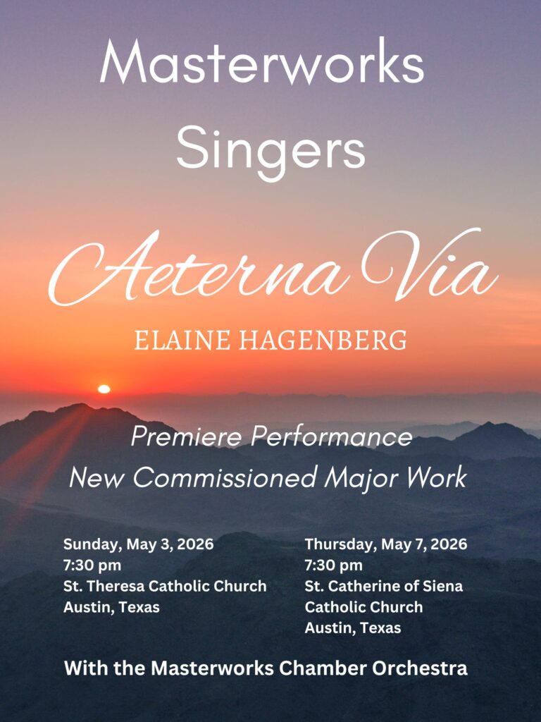 Thank you for your interest in our choir! Our next concerts will be held on Sunday, May 3rd at 7:30 p.m. at St. Theresa Catholic Church (4311 Small Dr., Austin, Texas 78731) and on Thursday, May 7th at 7:30 p.m. at St. Catherine of Sienna Catholic Church (4800 Convict Hill Rd., Austin, Texas 78749).